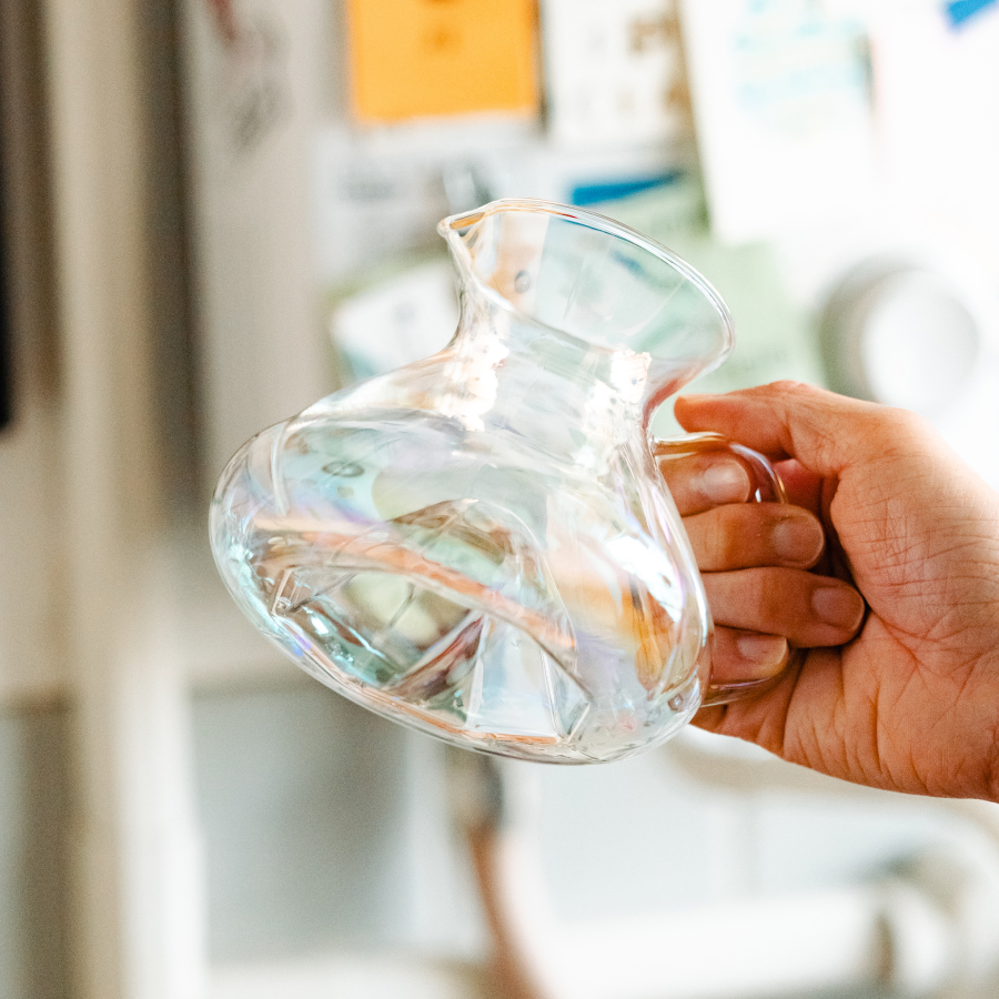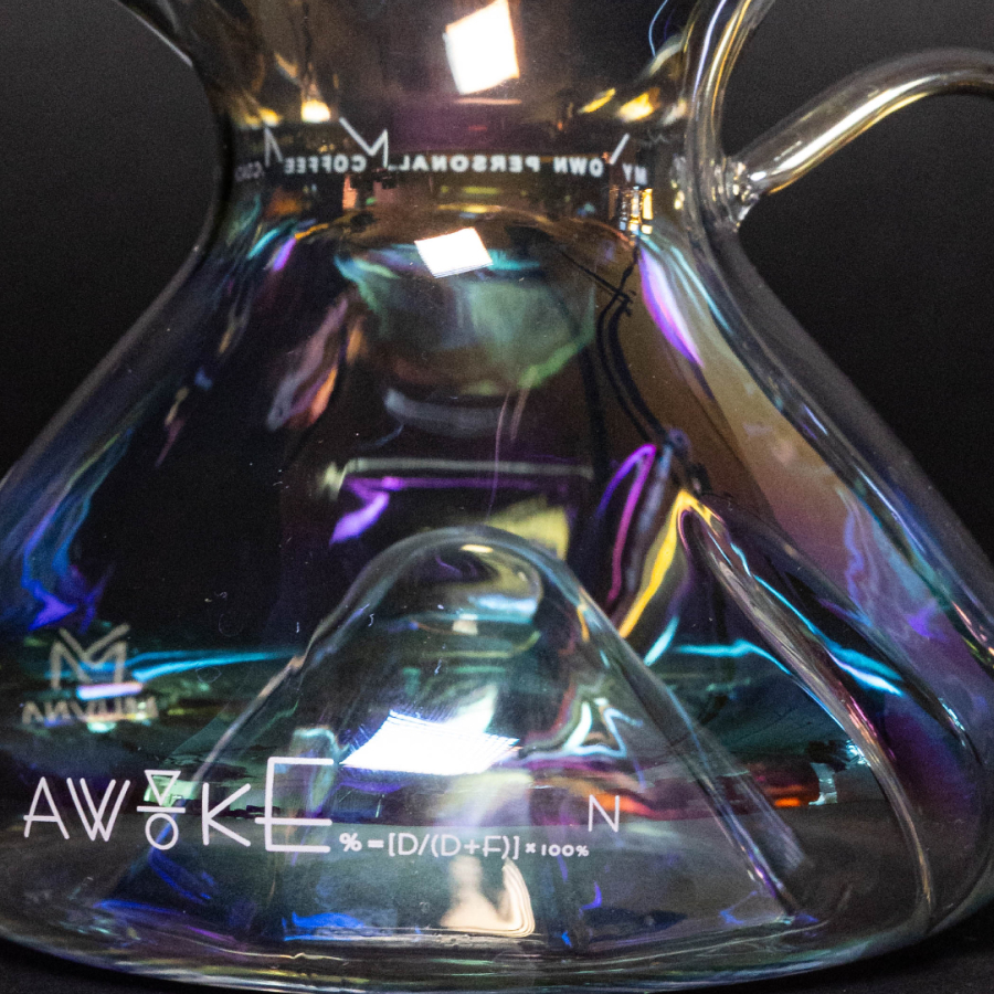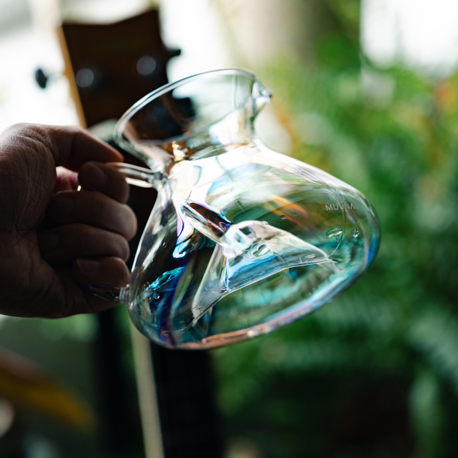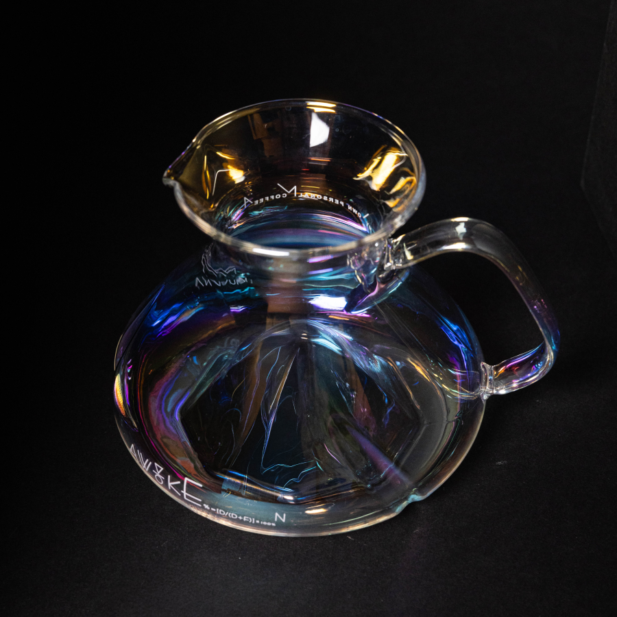 光の角度によって表情を変えるホウケイ酸ガラスのレインボーカラーが、抽出されたコーヒーの色合いをより印象的に映し出します。
